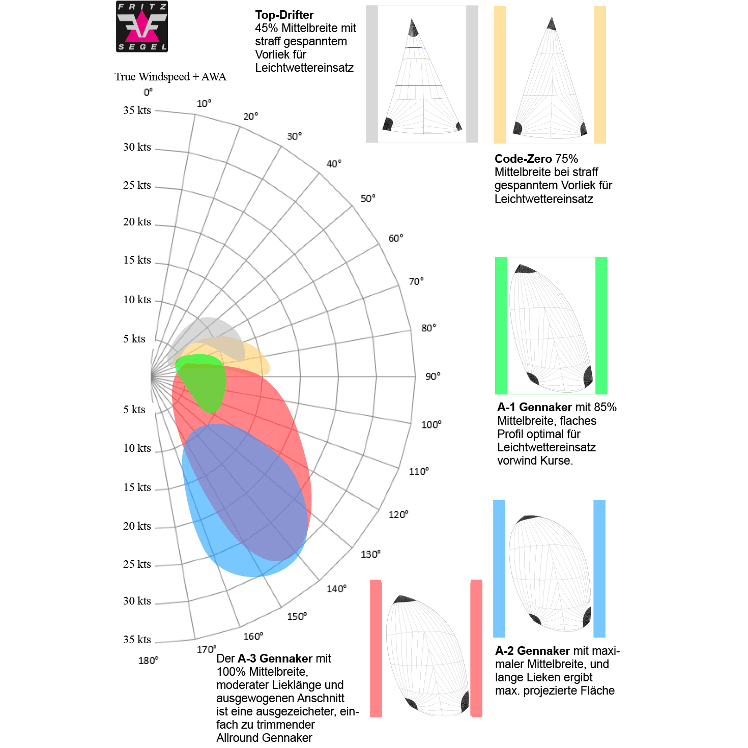 Je nach Einsatzbereich unterscheiden sich Gennaker in Größe, Profilierung und dem Material aus dem sie gemacht sind.