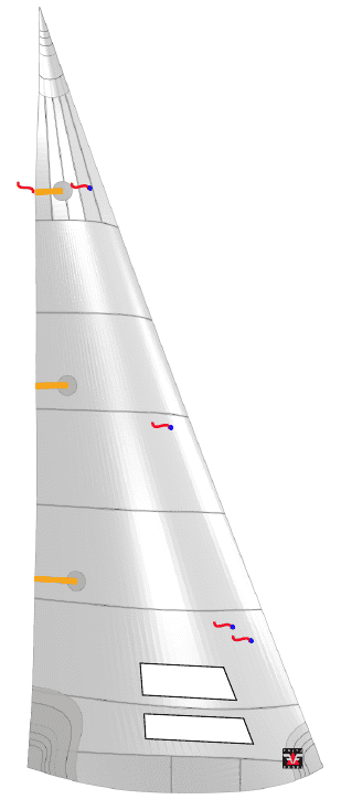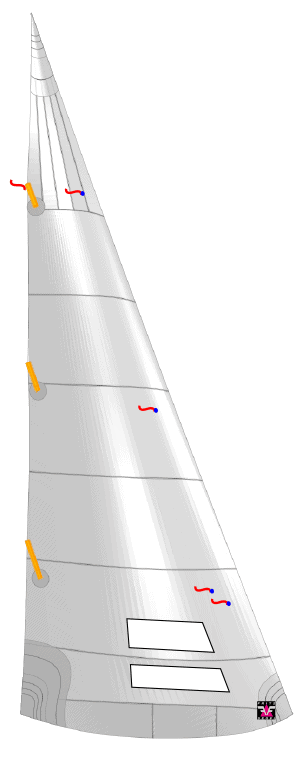 Das ausgewogene Profil und die Vorliekkurve bleiben unverändert, doch das Achterliek wurde leicht verkürzt. Dadurch wandern die Messpunkte der Segelbreiten weiter nach oben. Diese klassenkonforme Optimierung vergrößert die Achterlieksrundung und schafft zusätzliche Segelfläche im oberen Bereich — für mehr Druck, mehr Vortrieb und bessere Beschleunigung.
